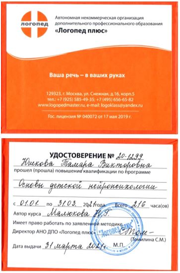 10. Курсы повышения квалификации в АНО ДПО «Логопед плюс» по теме «Основы детской нейропсихологии», в объеме 216 ч., г. Москва (2021 г.)